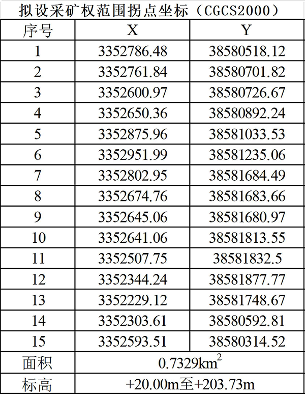 拟设矿区范围由15个拐点圈定,面积0.7458平方公里(1118.7亩),矿区涉及鄂城区碧石渡镇李家境村(黄土咀村、李家边村)。