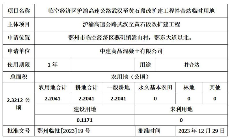临空经济区沪渝高速公路武汉至黄石段改扩建工程拌合站临时用地信息表
