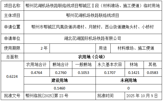 鄂州花湖机场铁路联络线项目鄂城区Ⅱ段(材料堆场、施工便道)临时用地信息表