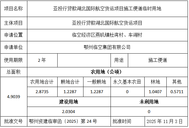 亚投行贷款湖北国际航空货运项目施工便道临时用地信息表