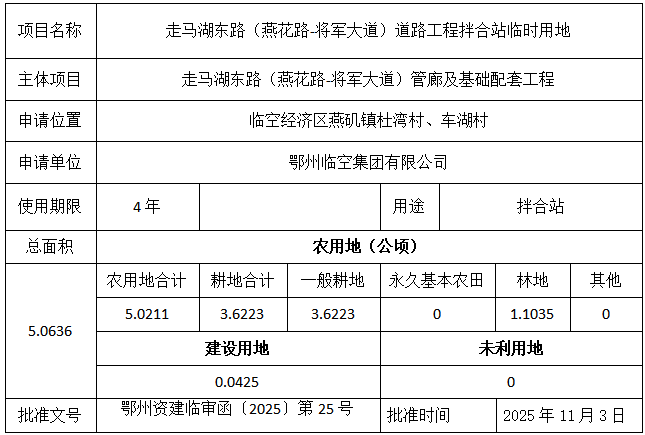 走马湖东路(燕花路-将军大道)道路工程拌合站临时用地信息表
